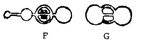 I came to see a bicycle or motorcycle as a dream symbol for a balanced condition. For example, a recently divorced woman dreamed of riding a unicycle precariously, while others rode bicycles. A number of patterns appeared that had a bicycle-like appearance, such as the two at Pepperbox Hill. (F&G below) They could be a before-and-after representation of the increasing feminine aspect. The central circle is like ancient glyphs of the duality, or Mother/Father Deity. The ancients said that the Deity is One but manifests as two. The glyph for the Monotheistic Deity is a single circle or a circle with ring. These are frequent crop patterns. ------ From Joe's notes (interpretation): The number 15 has shown up a few times. The first Pepperbox Hill formation, the bicycle-like pattern that I felt was a "before" symbol of the two, telling of the duality balancing coming had measurements of 5, 10, and 15. The "ladders" on the "Insectogram" pictograms had 7 or 15 rungs which appeared the following year. They always appeared in pairs. One appeared near Stonehenge in England. Joseph Campbell, the mythologist pointed out that the Easter celebration is held on the first full moon after the Spring equinox, which is the fifteenth day of the 28-day moon cycle. He related this to the 3 1/2 midpoint of the chakra symbolism and to the duality balancing. At that day of the year the full moon and the sun can be seen at the same time.