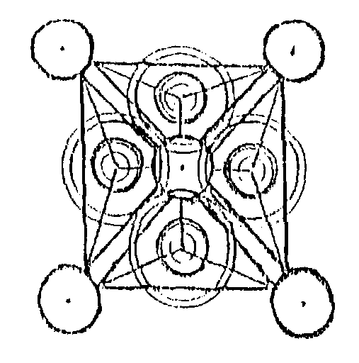 In 1992. I read several references to Ezekiel's vision of the Four Living Creatures, including the idea that the four creatures represent the Zodiac signs corresponding to the positions of the solstices and equinoxes during the Age of Taurus. I opened my Bible, and read the pertinent verses. I felt that coincidence was at work again, as the description seemed to fit with my drawing of the pyramid formed by the four triangles based on the Barbury Castle crop formation, which I've drawn in detail on Pollen Path 6 page. But, in my illustration, I had not drawn in the central circle with rings within the triangles. These seemed to correspond to the "four wheels" described by Ezekiel. I then drew in the circles with rings inside each of the four triangles -