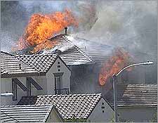 Calif. Sheriff Deputy Shot to Death By CADONNA M. PEYTON, Associated Press Writer SANTA CLARITA, Calif. (AP) - A man sought by federal agents shot and killed a sheriff's deputy Friday, then barricaded himself in a home that caught fire after officers lobbed tear gas inside hours later. The man fired hundreds of shots at the start of the standoff, when agents tried to arrest him for allegedly impersonating an officer. Firefighters stood by as the fire fully engulfed the house in the upscale neighborhood after residents were evacuated. Firefighters were kept away because the heavily armed gunman was still inside, the fire department said. Los Angeles County Sheriff Lee Baca tearfully told reporters that Deputy Jake Kuredjian, 40, a 17-year veteran of the department, was shot to death at 9 a.m. while serving the warrant at the home of James Beck. The warrant accused Beck of posing as a deputy U.S. marshal and stockpiling weapons, the U.S. Marshals Service said. There was an early report that a federal Alcohol, Tobacco and Firearms agent was wounded, but Deputy David Cervantes said later the agent was OK. Kuredjian was shot in the upper body and was taken to Henry Mayo Newhall Memorial Hospital and pronounced dead. Officers arrived around 8:30 a.m. to search Beck's home when a gunman began firing randomly out of the house, authorities said. SWAT team officers surrounded the home and fired tear gas inside. Gas clouds billowed from second floor windows moments later, and the blaze burned for about 20 minutes before firefighters began battling the fire. The Stevenson Ranch neighborhood, an area of half-million dollar homes 30 miles northwest of downtown Los Angeles, was evacuated while deputies and agents were brought in by helicopter. |