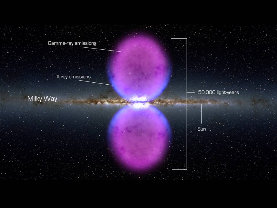 A giant gamma-ray structure was discovered by processing Fermi all-sky data at energies from 1 to 10 billion electron volts. The dumbbell-shaped feature emerges from the galactic center and extends 50 degrees north and south from the plane of the Milky Way, spanning the sky from the constellation Virgo to the constellation Grus. After processing the data enormous energy was detected in the galactic plane.