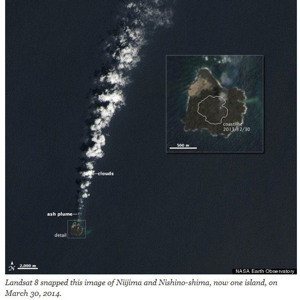 Now a satellite image taken March 30, 2014, by the Operational Land Imager on Landsat 8 shows that Niijima has actually overtaken Nishino-shima.