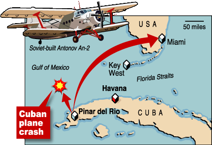 Tuesday, Sept. 19, 2000 Hijacked Cuban plane goes down near Florida FORT LAUDERDALE, Florida-- A Russian-built single-engine plane with as many as 18 people on board was hijacked out of Cuba on Tuesday and went down in international waters as it headed toward Florida, officials said. The plane, which was believed to be equipped with floats that would enable it to land on water, was apparently heading toward south Florida, Jim Reynolds, a spokesman for the Fort Lauderdale International Airport, told CNN. The U.S. Federal Aviation Administration reported the plane went down in international waters. The U.S. Coast Guard has dispatched ships and a rescue helicopter to the site where the plane either crashed or landed on the water, according to Petty Officer Scott Carr. CNN's Carl Rochelle said there was no communication from the aircraft to the United States. Havana Flight Control said the aircraft was headed in a north-northwesterly direction toward the United States.Its nearest possible U.S. destination would be Key West, Florida, some 90 miles away. Rochelle said the aircraft has the capacity to fly about 80 miles per hour. The Coast Guard said it was sending every available asset to search for the downed plane, Petty Officer Robert Suddarth told CNN. It was believed to be 60 miles southwest of Marquesas Key in the Florida Keys. According to an official at the Miami-Dade County Aviation Department, the plane left Cuba at about 9:30 a.m. EDT and disappeared from U.S. radar around 10:50 a.m. CNN Correspondent Carl Rochelle and The Associated Press contributed to this report. ~~~~~~~~~~~~~ Tuesday September 19, 2000 Survivors, Body, Found in Sea After Cuban Hijack By Jim Loney MIAMI (Reuters) - Nine survivors and a corpse were plucked from the ocean Tuesday after a small Cuban plane apparently trying to flee the communist-ruled island went down in open sea during what Havana said was a hijack. The survivors and corpse -- believed to be all the people on board the plane -- were picked up in the Yucatan Channel west of Cuba hours later by the merchant vessel Chios Dream as the U.S. Coast Guard (news - web sites) and military mounted an air and sea search. ``The Chios Dream encountered aircraft debris and found 10 people in the water. Those people have been recovered and are onboard the Chios Dream,'' Coast Guard Admiral Thad Allen said at a news conference at Opa-Locka Airport near Miami, from which U.S. authorities staged the search. There was confusion over how many people had been on board the Soviet-built Antonov An-2, with U.S. officials earlier saying as many as 18. But those who were rescued -- three men, three women and three children -- said they and the dead man whose body was recovered were the only ones on the plane, the U.S. Coast Guard reported. At least one of the rescued men was badly hurt with head and neck injuries. Cuban authorities notified U.S. officials that the plane was hijacked from the island's western province of Pinar del Rio Tuesday morning. An official at Cuba's Civil Aviation Institute said the plane was a crop-duster engaged in agricultural work, but there were no details on who was on board or how the hijacking was carried out. Another version of the incident was offered by Miami NBC affiliate WTVJ, which reported that the plane's pilot dropped off his co-pilot, picked up his own family and flew out of Cuba. The plane, which was low on fuel, was first reported missing over the Florida Straits after Miami police said it was heading for Florida. The site of the rescue added confusion to the incident. U.S officials initially believed the plane had gone down about 80 miles southwest of Key West in the Florida Straits. But the survivors and the body were found about 180 miles southwest of Key West in the Gulf of Mexico. It was not known if the plane had crashed or deliberately ditched. The Panamanian-flagged Chios Dream was headed toward Key West late Tuesday. A Coast Guard helicopter was to meet the vessel Tuesday evening and a medical corpsman was to be lowered to the ship to assess injuries. ``We will evacuate the injured male who has the head and neck injuries. We will then assess the medical condition of the remaining persons on board and will make a determination at that time as to whether any further medical care is needed,'' Allen said. Those who were not in need of medical care could be taken aboard a U.S. Coast Guard cutter, officials said. The U.S. Immigration and Naturalization Service declined to comment on what might happen to the survivors. Under U.S. immigration policy, Cubans who reach U.S. shores are generally allowed to stay but those rescued at sea are usually returned to Cuba unless they can convince U.S. authorities they would face persecution if repatriated. A senior State Department official, asked about how the U.S. government would deal with any hijackers, said, ``We don't even know if it has been hijacked. If they want an asylum hearing, that would be a consideration.'' White House spokesman Joe Lockhart said that when U.S. officials were told there had been a hijacking, F-15 and F-16 jets were scrambled but never picked up the plane on radar. There have been several hijackings of planes from Cuba in past years. In the last high profile incident, in August 1996, a small plane hijacked by three Cubans who forced the pilot to fly to Florida plunged into the Gulf of Mexico. All four Cubans on board were rescued by a Russian freighter. In that case, as in several others in the past, a federal court in Tampa, Florida, acquitted the three Cubans of the hijacking a year later. The acquittal was vigorously denounced by Havana, which said it could encourage similar actions by other Cubans. The An-2 was designed just after World War II as a long-range bush plane to support forest rangers in vast Siberian forests. One model of the plane, the An-2V, is a floatplane version. Many aircraft in Cuba's civilian and military fleet are of Soviet origin, dati