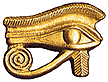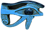 ~~~~~~~~~~~~~ The reverence shown to parents is one of the virtues symbolized by the udjat, and the amulet could be used as a substitute for any of the offerings an eldest son was supposed to provide daily at his father's tomb. It was believed to ward of sickness and capable of bringing the dead to life (as it did with Osiris). The eye was also placed in the wrappings of the mummies over the incision where the embalmers removed the internal organs. Damaging the body in any way was considered bad luck for the deceased, and the Egyptians hoped to protect it by placing the amulet over the cut. Horus, the son of Osiris and Isis, was called "Horus who rules with two eyes." His right eye was white and represented the sun; his left eye was black and represented the moon. According to myth Horus lost his left eye to his evil brother, Seth, whom he fought to avenge Seth's murder of Osiris. Seth tore out the eye but lost the fight. The eye was reassembled by magic by Thoth, the god of writing, the moon, and magic. Horus presented his eye to Osiris, who experienced rebirth in the underworld. As an amulet the Eye of Horus has three versions: a left eye, a right eye, and two eyes. The eye is constructed in fractional parts, with 1/64 missing, a piece Thoth added by magic... The Egyptians used the eye as a funerary amulet for protection against evil and rebirth in the underworld, and decorated mummies, coffins, and tombs with it. The Book of the Dead instructs that funerary eye amulets be made out of lapis lazuli or a stone called mak. Some were gold-plated. It was called the "all-seeing Eye." Other attributes associated with it are terror and wrath. According to some myths, the eye took on a personality of its own, swooping down out of the sky to right wrongs... |
