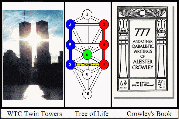 The symbolic nature of the events is reinforced by comparing the Twin Towers to the left and right pillars of the Tree of Life, indicated by Crowley's book cover, on the right, below --