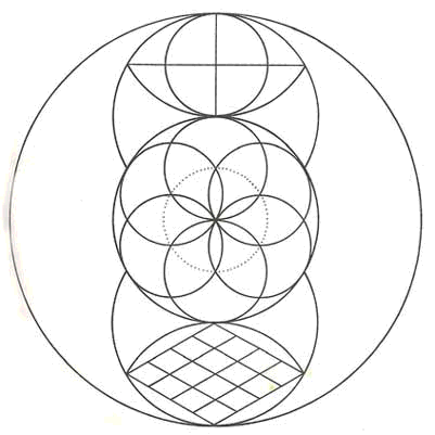 This diagram of the 153 fishes in the net is earlier than Christianity and is associated with the symbolism of Apollo at Delphi. Apollo is the earlier Greek personification of the Logos, the universal mediator, and it is ultimately from the mathematical symbolism of Apollo, the god of harmony, that both the diagrams of the 153 fish in the net and the feeding of the five thousand originate. Both of these diagrams are ultimately based on the numerical value of square root of 2 (1.415), the mathematical symbol of the ideal mean between unity and multiplicity, which is reflected in the title THE GOD APOLLO, 1415. In the Christian version of John 21, the "foundation stone" of the geometry is the central circle of SIMON PETROS, 1925, the omphalos of Christianity, whose number determines the dimensions of the entire diagram. In this Christian adaptation, we start with "the omphalos" to arrive at the symbol of "the net". Likewise, in the earlier symbolism of Apollo, his omphalos at Delphi was covered with a net, symbolizing the veil of manifestation, woven from the central source of harmony. In the earlier version, the central circle symbolizes the omphalos at Delphi, the meeting point of heaven and earth, "the golden mean" of Apollo, The number 153 also figures in Delphic symbolism, for 1530 is the sum of DELPHI, 619, and OMPHALOS, 911. Finally, if we draw a circle around the three worlds diagram, (above) the all-encompassing sphere has the measure of 7690, and 769, is the value of PYTHIOS, Apollo at Delphi.