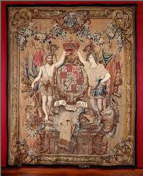 This tapestry was woven after William and Mary were crowned .When William and Mary were crowned they became king and queen of England, Scotland, Ireland and France. The claim to France dated from the Middle Ages, it was by now a fiction but continued until 1801. Scotland and England were brought under one crown in 1603 and Ireland, which had been fought over since 1171, was finally subdued by William in 1690 at the Battle of the Boyne. king and queen on 11 April 1689 - 21 April 1689. Different dates are sometimes quoted for historical events since the reform of the calender presented by Pope Gregory XIII in 1582 was not adopted everywhere simultaneously. The switch to the Gregorian calender involved an adjustment of ten days and the removal of the start of the year to 1 January, instead of Christmas, Easter or, as in Britain, Annunciation Day. While the New Style calendar soon replaced the Old Style or Julian calender in most of the Dutch provinces, the British waited until in 1752: 31 December 1751 was followed by 1 January 1752 (instead of 1 January 1751, as it would have been) and 2 September 1752 by 14 September 1752 (the difference had by then increased to eleven days). - and before Mary died in 1695. LARGE IMAGE OF UNICORN - HERALDRY TAPESTRY From: http://www.rijksmuseum.nl/images/aria/ng/z/ng-519.z