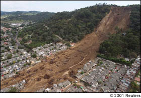 Sunday, January 14, 2001 By Associated Press Rescue workers recover a mudslide victim from the Santa Tecla neighborhood of San Salvador. Rescuers using sticks and their bare hands dug for survivors in buried homes Sunday after a powerful earthquake struck El Salvador and Guatemala, killing at least 122 people and leaving many more missing. In the confusion following Saturday's 7.6-magnitude quake, officials gave varying accounts of the damage. The Red Cross said Saturday that about 1,200 people were unaccounted for in the buried Las Colinas neighborhood just west of El Salvador's capital. At least 120 people are known to be dead and 10 were missing across the country, a National Emergency Committee announced Sunday. Two people died in Guatemala. National Police in El Salvador put the toll at 234 confirmed dead and 2,000 injured. Police said 16,148 houses were damaged and 4,202 destroyed. Police reported damage to 87 churches and 39 other buildings. "It was like a wave of dirt that covered us," said Emilio Renderos, 60, a watchman employed in Las Colinas. "It was horrible." Pope John Paul II on Sunday urged the international community to come to the aid of earthquake victims in Central America. Mexico sent an air force plane early Sunday with aid and promises of help came from the United States, Spain and Taiwan. Rescuers fought to pry into the 1,500-foot landslide that had buried an estimated 300 homes in the middle-class neighborhood. By morning, 61 bodies had been recovered at Las Colinas. At least three survivors had yet been found in the mass of dirt and concrete. The quake shattered buildings in several cities in this Central American nation of 6 million. Smaller aftershocks were felt in San Salvador late Saturday, but there was no immediate information on their magnitude. The earthquake measured 7.6 on the Richter scale and caused a mudslide in the Salvadoran town of Santa Tecla. Centered off El Salvador's southern coast, the temblor also rocked Honduras and Guatemala. Buildings swayed as far away as Mexico City. Salvadoran President Francisco Flores declared a national emergency and appealed for international help to search for survivors. A distraught Arturo Magana, 25, wandered about in Las Colinas, trying to find his 18-year-old brother, Jaime. "I don't know where to dig because I don't know where the house is," he said. In the southeastern town of San Miguel, the wall of a hospital collapsed and 25 people were known to be dead in a small village nearby. The U.S. Agency for International Development said it had three people in El Salvador before the quake and that five more were en route. As soon a suitable airport is open, the agency plans to send a planeload of relief supplies, including medical kits, blankets and plastic sheeting, from a stockpile in Miami. The quake knocked out El Salvador's telephone service and electricity for several hours, impeding the spread of news. Only sketchy reports had arrived from many hard-hit areas. In Santa Ana, about 35 miles northwest of the capital, the 116-year-old El Calvario church collapsed, killing at least one employee and possibly others worshipping inside, according to the Rev. Robert Castro. The Red Cross reported that 13 people died in nearby Sosonati. Some 200 other victims were rushed to the area hospital, which authorities weren't sure was still structurally sound. The quake was centered off the Salvadoran coast, about 65 miles southwest of San Miguel, according to the U.S. Geological Survey in Denver, Colo. It took more than an hour for some San Salvador radio stations to return to the air and telephone service remained spotty at mid-afternoon. There were cracked buildings and shattered windows across the city of 500,000. Officials at San Salvador's international airport said all flights had been canceled Police in neighboring Guatemala said a man and a 2-year-old girl were killed and three other people were injured when a pair of homes collapsed in the city of Jalpataua. Local radio stations reported the collapse of a church in Suchitepequez, in southern Guatemala. The quake set off car alarms and temporarily knocked out electricity, radio, television and cellular phone service all over Guatemala, but most service was quickly restored. Honduran officials reported cracked buildings in several cities, but there were no reports of injuries. A 1986 earthquake centered near San Salvador killed an estimated 1,500 people and injured 8,000.