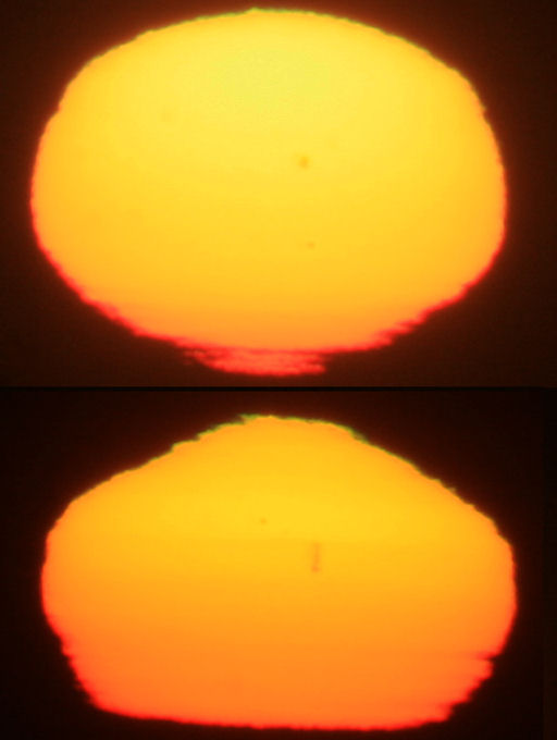 across the sun during the series of exposures." Seguin has prepared a movie showing what an eclipse looks like at one of SDO's extreme ultraviolet wavelengths: click to play. "Eclipse season will be over on Oct. 6th," he says. Meanwhile, stay tuned for strange.SUNSPOT MIRAGE: Lately, sunspot 1109 has been attracting the attention of sunset sky watchers. When the sun is dimmed by haze and low clouds, the behemoth spot can be seen and photographed as a dark mark on the solar disk. Yesterday evening in San Francisco, the spot got even bigger when it was stretched and distorted by a lovely sunset mirage:took the picture overlooking San Francisco Bay. "The sun and sunspot 1109 were constantly changing shape as the sun set," says Zinkova. "It was wonderful. A small green flash at the end added nicely to the mood." Click here to view the complete sunset sequence. Sunspot 1109, which stretches more than 100,000 km from end to end, is slowly growing as it transits the solar disk. The forecast calls for another week of sunset sunsets before the region disappears over the sun's western limb. more images: