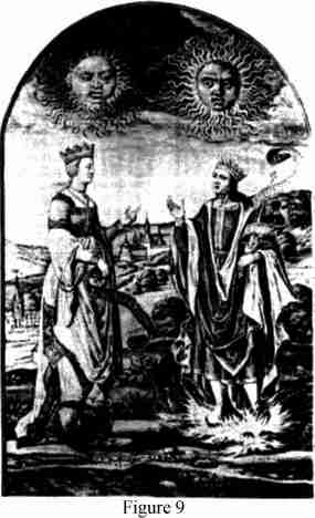 | The alchemical King and Queen, Rex and Regina, standing upon the dual eternal principals represented by sun and moon, join in the holy wedding, the hierosgamos. The image of this eternal, transformative union was perhaps mirrored in Joseph Smith's ritual of celestial marriage. Trismosin, "Splenor solis" (MS., 1582) |
